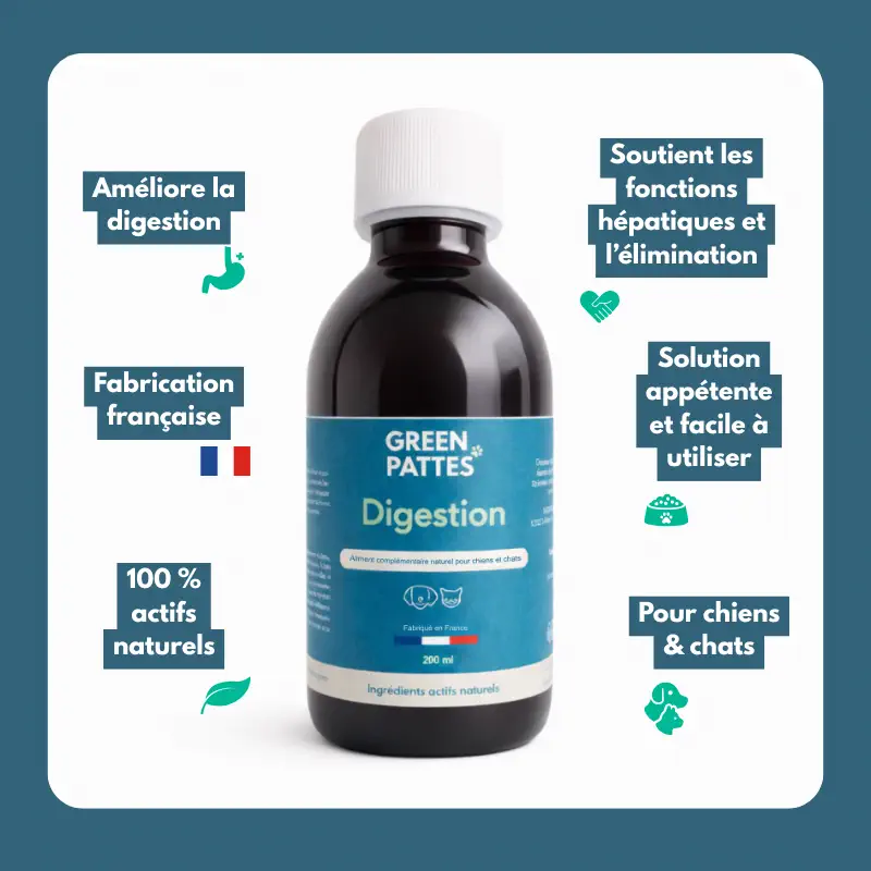 Le Complément Digestion pour chien et chat – Confort digestif a été conçu pour accompagner les animaux présentant une digestion sensible, des troubles digestifs ponctuels ou un inconfort intestinal. Il est particulièrement recommandé lors de changements alimentaires, après des excès, ou en soutien des fonctions hépatiques.