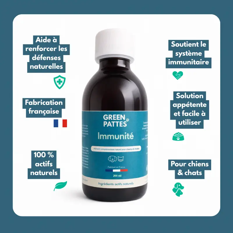 Le Complément Immunité pour chien et chat – Défenses naturelles soutient activement le système immunitaire. Il aide votre compagnon à mieux résister aux agressions extérieures. De plus, il constitue une aide précieuse lors des changements de saison, en période de fatigue, de stress ou encore pendant une convalescence.