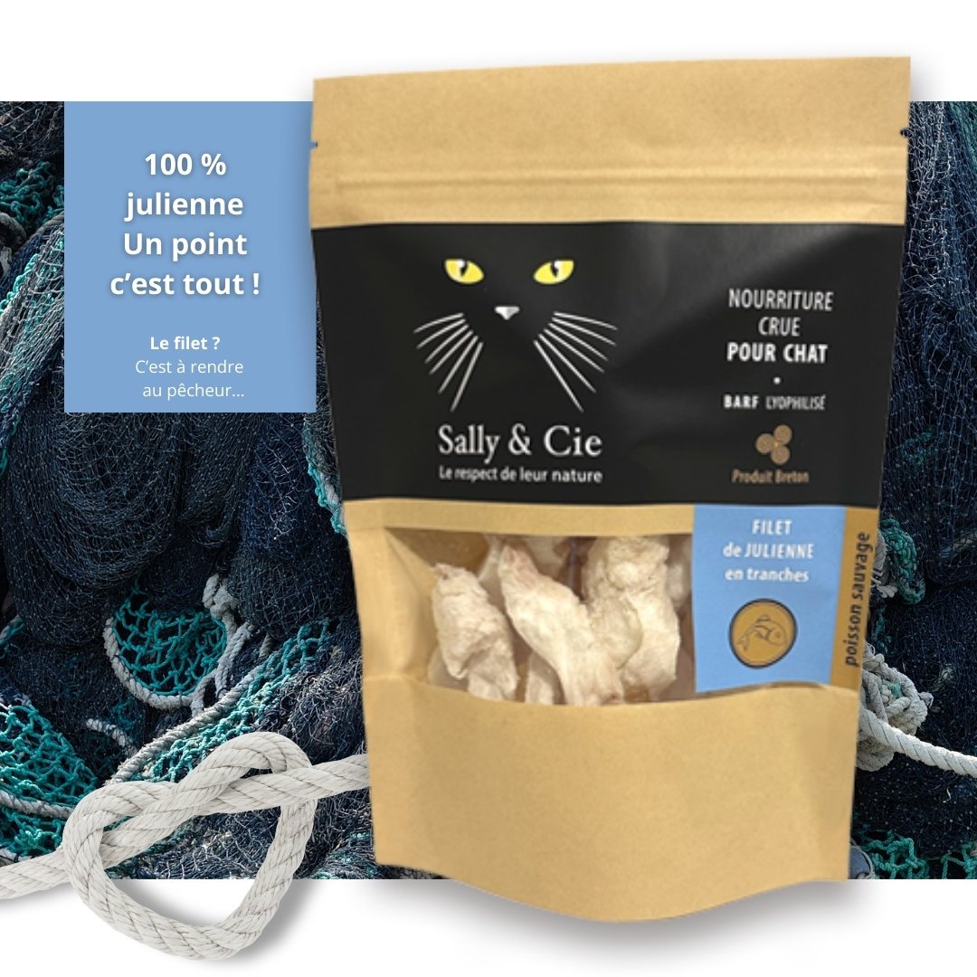 La julienne possède une chair blanche nacrée et ferme, idéale pour la digestion des chats. Pour Sally et Cie, les pêcheurs attrapent le poisson à la palangre ou au filet dans les eaux profondes de l’Atlantique nord-est. De ce fait, la fraîcheur et la traçabilité sont garanties. De plus, cette origine premium renforce la qualité nutritionnelle des croquettes.