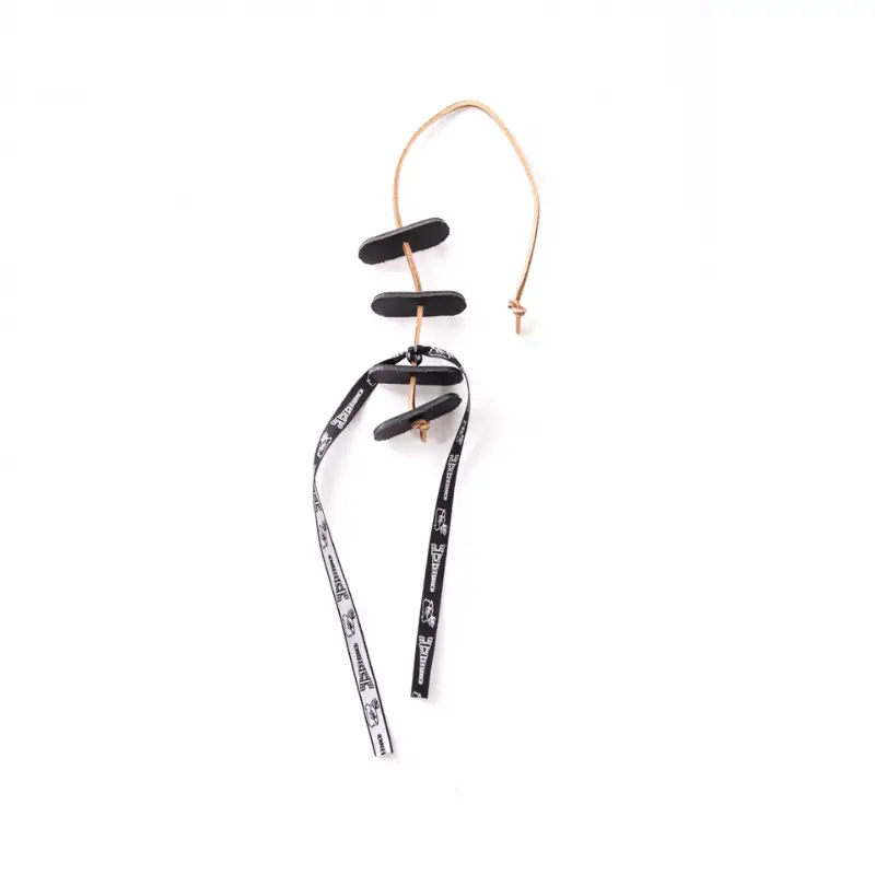 Fabriqué à la main en France, il est réalisé à partir de matières réexploitées issues d’ateliers de fabrication et de chutes de cuir provenant de la production d’accessoires. Sa conception associe cuir, tissu et ruban pour offrir texture, légèreté et mouvement, rendant chaque interaction plus stimulante.