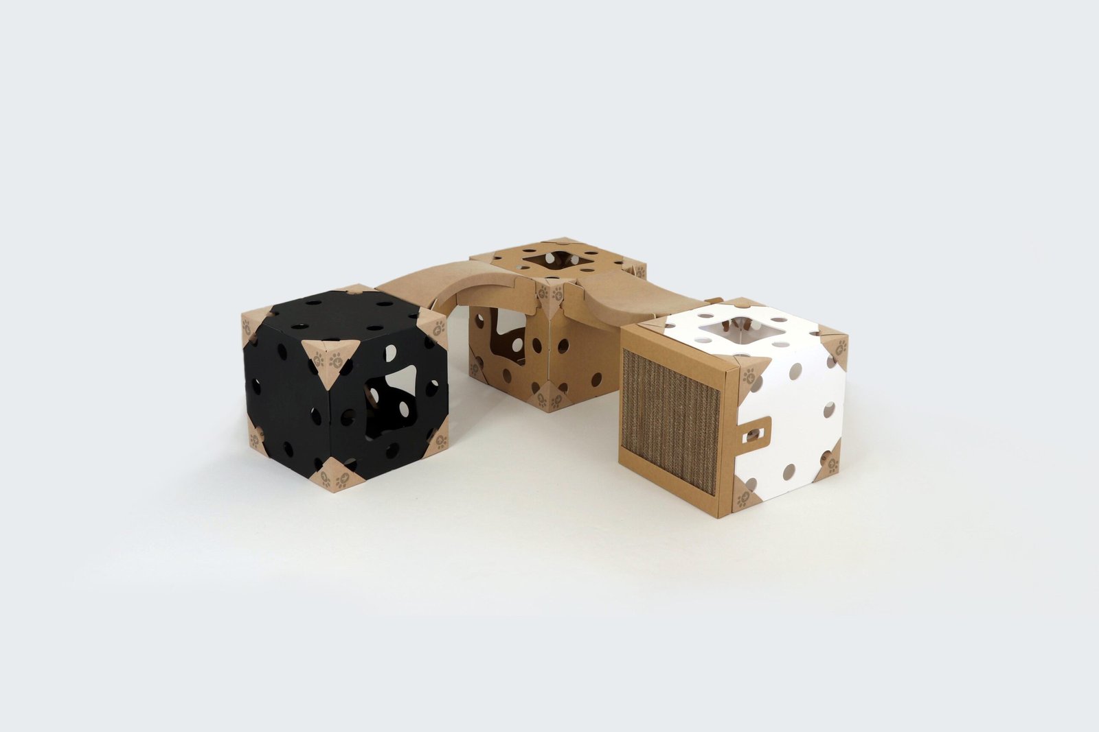 Le kit Funny ajoute une touche de fantaisie à l’arbre à chat Kléo. Il combine 3 cubes de couleurs différentes (kraft, blanc et noir), 1 griffoir et 2 arches, pour un design plus dynamique et un parcours varié.