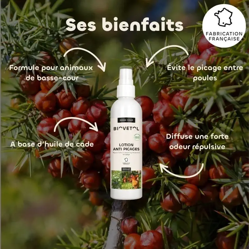 La lotion anti-picage Biovetol est destinée aux poules et volailles sujettes au picage. Ce comportement, fréquent en basse-cour, peut entraîner blessures, stress et déséquilibre du groupe.