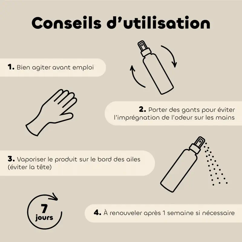 Cette lotion est une solution d’appoint, à utiliser en complément d’une amélioration des conditions de vie (espace, alimentation, équilibre du groupe).