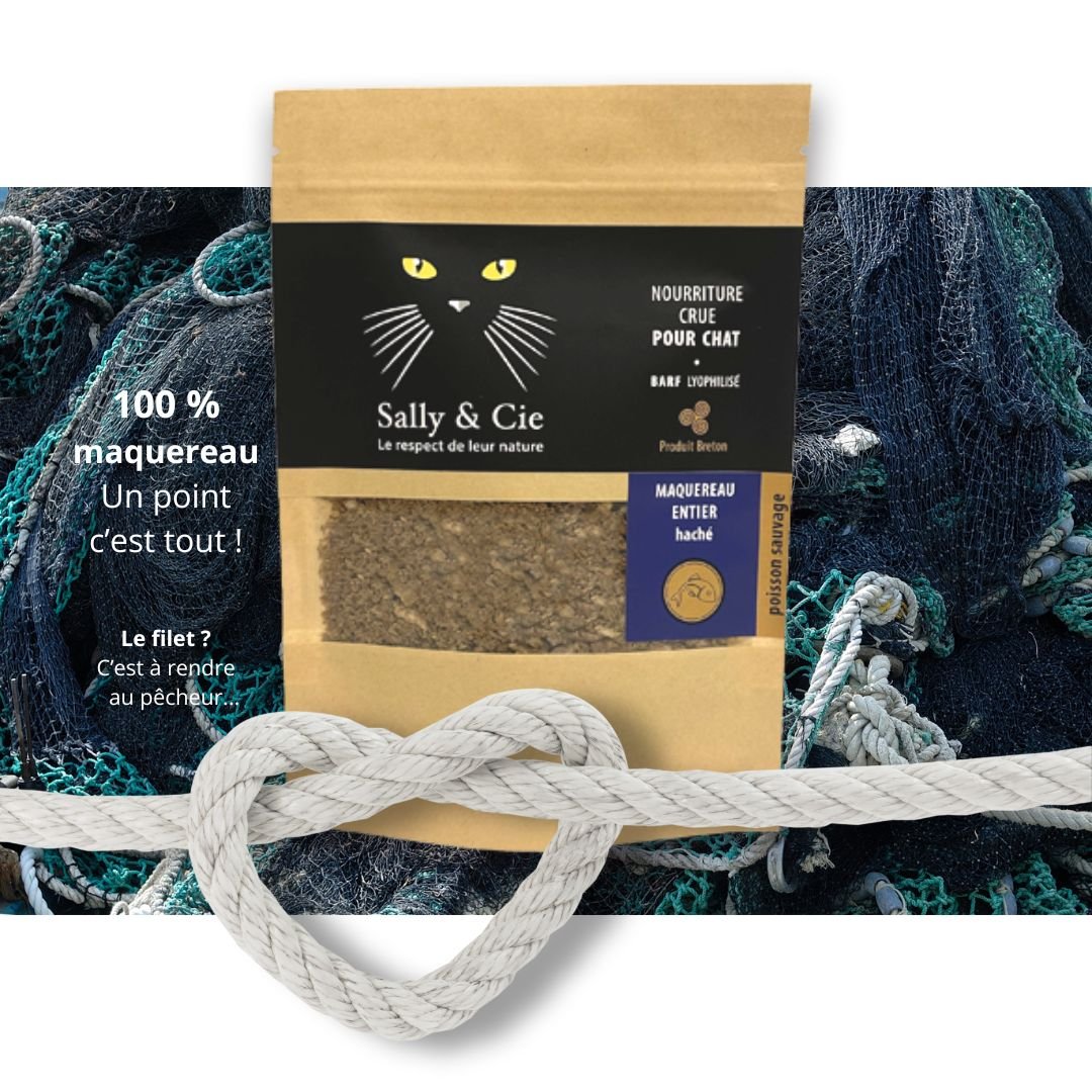 Le maquereau est un poisson « mi-gras » qui se déplace en bancs et possède de superbes rayures bleues argentées. Pour Sally & Cie, les pêcheurs attrapent le poisson au large de l’Aber Wrac’h, garantissant fraîcheur et traçabilité. De plus, les croquettes conservent leur richesse en oméga 3, ce qui contribue à la santé de la peau et du pelage.