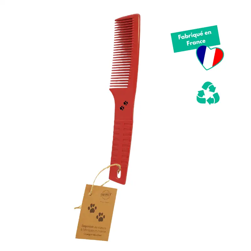Fabriqué en France en plastique 100% recyclé, ce peigne allie performance et engagement environnemental. Chaque détail est pensé pour un produit durable qui réduit l’impact sur la planète tout en offrant un soin de qualité à votre animal.